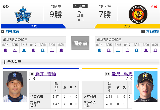 橫濱這禮拜的賽程相當艱鉅,接連的碰上排名前列的阪神與巨人;與阪神交手兩場比賽後橫濱是拿下1勝1負的戰績,系列戰的最後一戰,經驗相當豐富的藤井秀悟將肩負取勝的重任,在阪神這邊,同樣不甘示弱推出成績不俗的能見篤史掛帥,究竟哪一方能夠搶下本次系列戰的對戰優勢,讓我們繼續看下去...