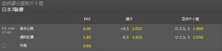 初盤各家公司給到浦和平/半組合,截稿前幾乎都做了升盤處理,初步判斷浦和紅鑽可勝不穩,考量到雙方對戰並沒有明顯的優劣以及主客場因素,估計浦和紅鑽仍然是以攻帶守,第一落點應當是大球。