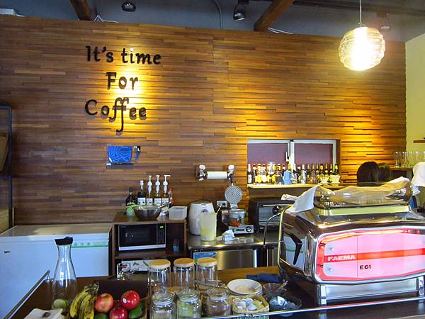 接著看到吧檯的部分,除了有簡約的感覺外,更讓牛肉好奇的是它們的咖啡機(就是亮紅光的那個~),頗有美式餐廳的感覺,蠻特別的
